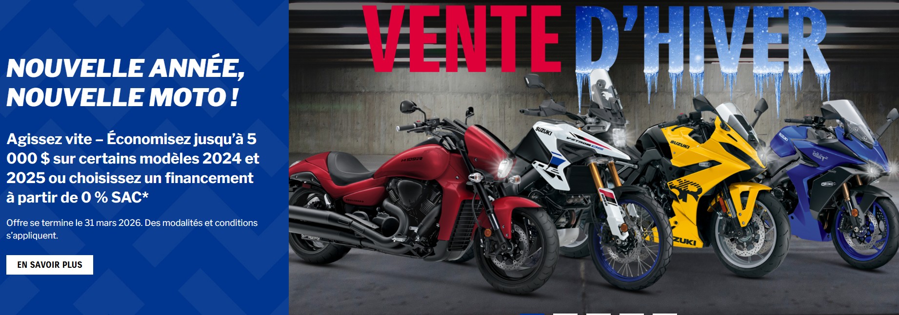 Découvrez notre inventaire CFMOTO et Suzuki. Vous y trouverez des motos, VTT et côte à côte.